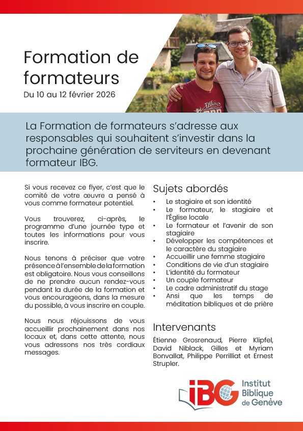 La formation des formateurs et formatrices s’adresse aux responsables qui souhaitent devenir formateur ou formatrice IBG. La prochaine formation aura lieu du 10 au 12 février 2026.